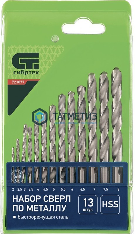 Набор сверл по металлу, 2-8 мм (через 0,5 мм), HSS, 13 шт.,пластик. коробка цил. хвостовик// Сибртех